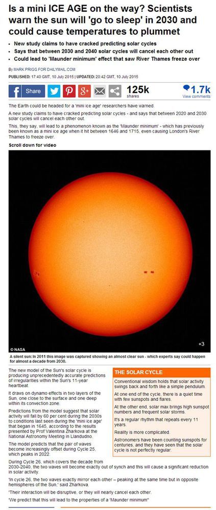 近些天來(lái),媒體上一則題為《太陽(yáng)2030年將休眠地球即將步入冰河時(shí)期》的新聞被廣泛傳播、轉(zhuǎn)載。12日新浪微博“頭條新聞”引用了此報(bào)道后,被網(wǎng)友轉(zhuǎn)發(fā)了1萬(wàn)7千余次,一時(shí)間諸多網(wǎng)友對(duì)地球即將“冰凍”深感惶恐。