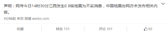 聲明:網(wǎng)傳今日14時30分江西發(fā)生6.9級地震為不實消息,中國地震臺網(wǎng)亦未發(fā)布相關內容。