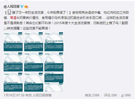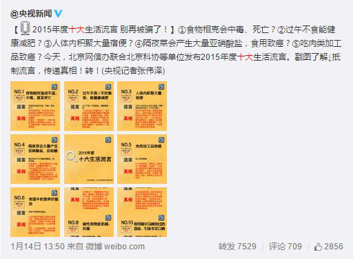 1月14日,由北京市互聯網信息辦公室、北京市科學技術協會、首都互聯網協會指導北京地區網站聯合辟謠平臺、蝌蚪五線譜、百度知道等機構聯合發布的《2015年度十大生活流言榜》成為近日熱議話題,該榜單為堿性食物、常溫奶、隔夜菜等十大食品流言辟謠。且央視新聞、人民日報、北京衛視等多家官方微博微信賬號進行官方轉播。