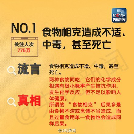 其中,對關注度最高的“食物相克造成不適、中毒,甚至死亡”的流言,專家指出兩種食物同吃,它們的化學成分相遇有極小概率產生拮抗作用,發生化學反應,但不足以影響人體健康。所謂的“食物相克”后果多是由食物不潔或烹調不當造成,而且過量食用單一食物也會造成同樣后果。