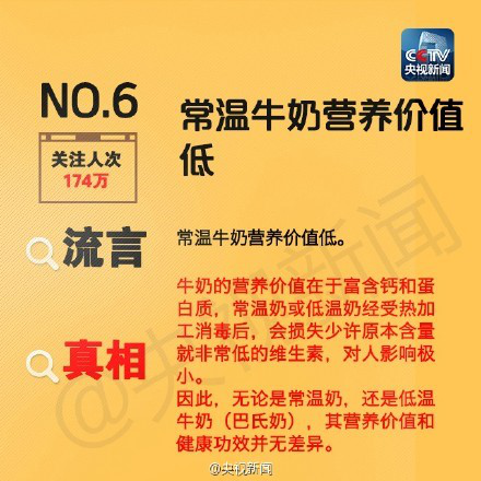 而針對“常溫牛奶營養價值低”的流言,專家也從科學依據角度進行說明,牛奶的營養價值在于富含鈣和蛋白質,常溫奶或低溫奶經受熱加工消毒后,會損失少許原本含量就非常低的維生素,對人影響極小。因此,無論是常溫奶,還是低溫牛奶(巴氏奶),其營養價值和健康功效并無差異。