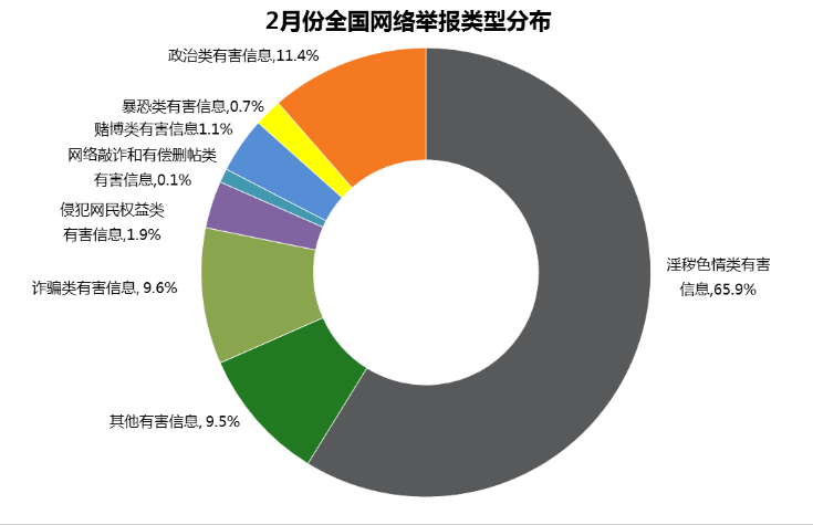 2月份,中國互聯(lián)網(wǎng)違法和不良信息舉報中心直接受理、處置網(wǎng)民有效舉報32982件。經(jīng)核查,會同相關(guān)執(zhí)法部門處置色情、詐騙、賭博網(wǎng)站及鏈接15030條;通知騰訊、新浪微博等網(wǎng)站,搜狗等搜索引擎服務(wù)商,百度云盤、115網(wǎng)盤在等線存儲工具服務(wù)商刪除色情低俗有害信息7653條;通知網(wǎng)易網(wǎng)、天涯論壇、凱迪社區(qū)、人人網(wǎng)等網(wǎng)站刪除虛假信息3974條,刪除暴恐有害信息2580條;通知新浪、騰訊、網(wǎng)易、百度依法處置傳播虛假信息的博客賬號543個、微博賬號439個;通知騰訊依法處置傳播色情低俗信息、售賣槍支彈藥等違法活動的即時通信賬號816個;通知新浪微博、騰訊微信等網(wǎng)站刪除一些網(wǎng)絡(luò)名人濫用自身影響力發(fā)布的違反憲法基本原則、損害國家榮譽和利益的違法違規(guī)信息1031條;刪除“上海女孩逃離江西農(nóng)村”“東北村莊農(nóng)婦組團‘約炮’”“免費領(lǐng)上海迪士尼樂園門票加送2600元酒店住宿”等虛假信息916條。
