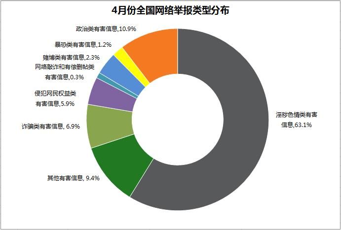 4月份,中國互聯網違法和不良信息舉報中心直接受理、處置網民有效舉報40632件,較上月增長16.2%。經核查,會同相關執法部門處置色情、詐騙、賭博網站及鏈接19921條;通知百度貼吧、新浪微博、騰訊、115網盤等網站、搜索引擎服務商、在線存儲工具服務商刪除色情低俗有害信息98096條;通知中國日報網、果殼網、中華網等網站刪除含有血腥殘忍內容、販賣毒藥、教授炸藥制作方法的暴恐有害信息1620條;通知新浪、騰訊、網易、百度依法處置傳播虛假信息的博客賬號62個、微博賬號58個;通知騰訊依法處置煽動民族仇恨,從事販賣假幣、毒藥、槍支等違法活動的即時通信賬號923個;通知鐵血網、人人網、愛卡汽車網等網站刪除歪曲黨史國史、鼓吹房價上漲、唱衰我經濟發展前景等刻意制造恐慌、煽動不滿情緒的虛假信息9875條。