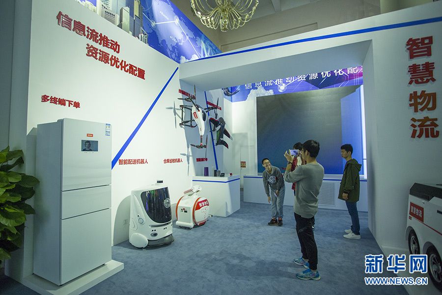 “砥礪奮進的五年”大型成就展網絡科技特色體驗展區“智慧物流”專題部分,圖中展示的是物流無人機、無人車、終端配送機器人。物流是國民經濟的動脈,這個專題展示的是我國智慧物流的新成就。新華網記者李林攝