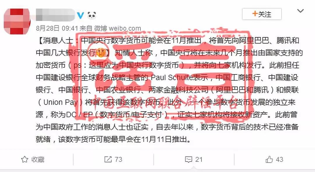 就此,中國(guó)互聯(lián)網(wǎng)聯(lián)合辟謠平臺(tái)向中國(guó)人民銀行求證,證實(shí)網(wǎng)傳數(shù)字貨幣推出時(shí)間及參與機(jī)構(gòu)等均為不準(zhǔn)確信息。