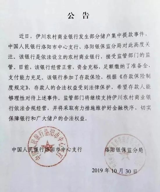 30日,中國人民銀行洛陽市中心支行及洛陽銀保監(jiān)分局發(fā)布公告進(jìn)一步回應(yīng)。公告表示,目前伊川農(nóng)商行經(jīng)營正常、資金充裕,足額繳納了準(zhǔn)備金,支付能力充足,且該行參加了存款保險(xiǎn),存款人的合法權(quán)益受到法律保護(hù)。