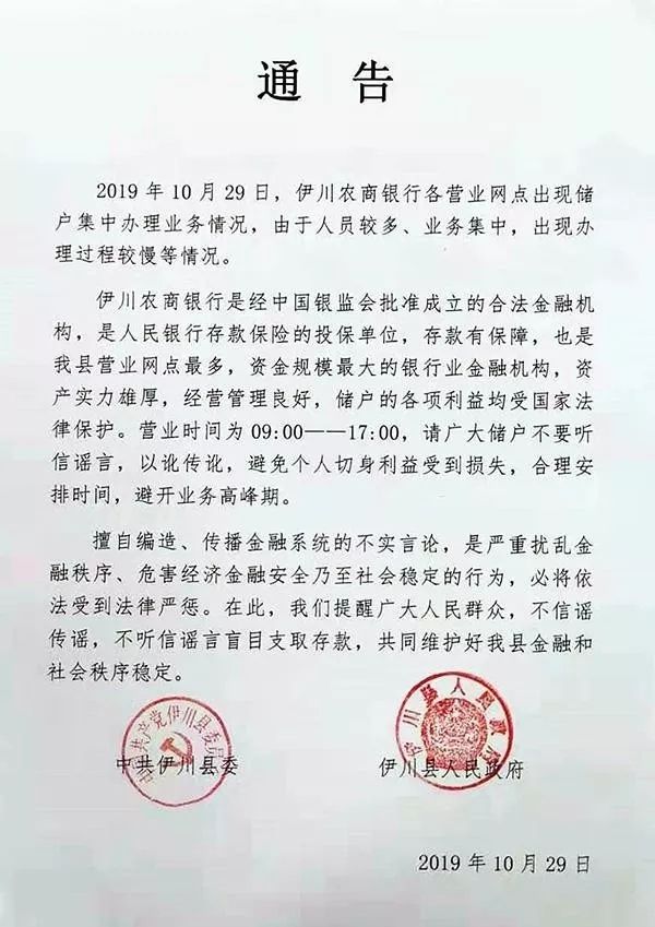 當(dāng)天下午,伊川縣委縣政府即發(fā)布通告辟謠,并提醒儲(chǔ)戶勿聽信謠言,以訛傳訛,避免個(gè)人切身利益受到損失。