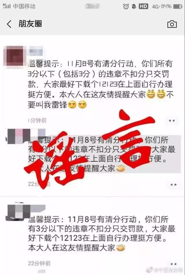 近日,寧夏本地多個微信群和朋友圈熱傳一條消息稱,“溫馨提示:11月8號有清分行動,所有3分以下違章不扣分只交罰款。大家最好下載一個12123在上面自行辦理挺方便。本人在這里友情提醒大家,不要叫我雷鋒。”