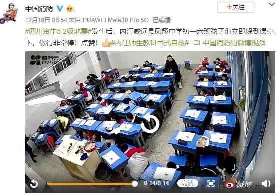 8點54分@中國消防 發布了內江威遠縣鳳翔中學初一六班學生們在老師組織下正確采取避險措施的視頻,并為孩子們點贊