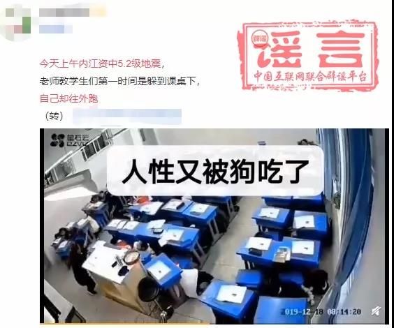 然而隨后,網上卻出現了這樣的消息:“今天上午內江資中5.2級地震,老師教學生們第一時間是躲到課桌下,自己卻往外跑”。