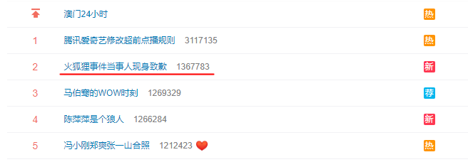 18日10時(shí),微博話題#火狐貍事件當(dāng)事人現(xiàn)身致歉#迅速登上熱搜榜,網(wǎng)絡(luò)上有關(guān)火狐貍的信息超過130萬(wàn)條。