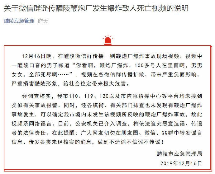 12月16日晚,在醴陵微信群傳播一則鞭炮廠爆炸事故現(xiàn)場視頻。視頻中一醴陵口音的男子喊道“你看啊,鞭炮廠爆炸,100多號人在里面啊,男男女女,全部死盡啊……”。視頻在各微信群傳播擴散,帶來嚴重負面影響,嚴重損害醴陵形象,給社會穩(wěn)定帶來極大危害。