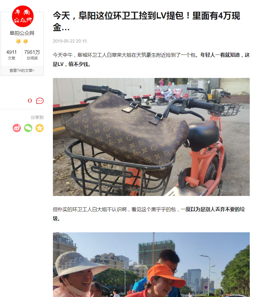 據安徽阜陽媒體報道,今年5月的一天中午,安徽阜城環衛工人白翠榮大姐撿到了一個LV包,和同事一起打開包后,白大姐嚇壞了,里面竟然放著整整4摞嶄新的百元大鈔。失主姚先生在接到環衛公司的電話后趕來,他表示這只包價值一萬多元,包里不僅裝有4萬元現金,還有一份比現金重要得多的合同。白大姐的樸實善良,讓失主姚先生很感動。姚先生掏出現金硬塞給白大姐,白大姐說什么都不肯收。對于白大姐拾金不昧的行為,環衛公司表示將給予經濟上的表彰和精神上的鼓勵。