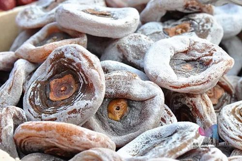 柿餅上的白霜其實是柿餅制作工程中天然形成的糖霜,并不是防腐劑,是可以食用的。收獲的柿子削皮后進行晾曬,晾曬過程中柿子內部的水混著糖滲到了果實表面,當水分蒸發(fā)后,糖結晶積累到表面就形成了白霜。