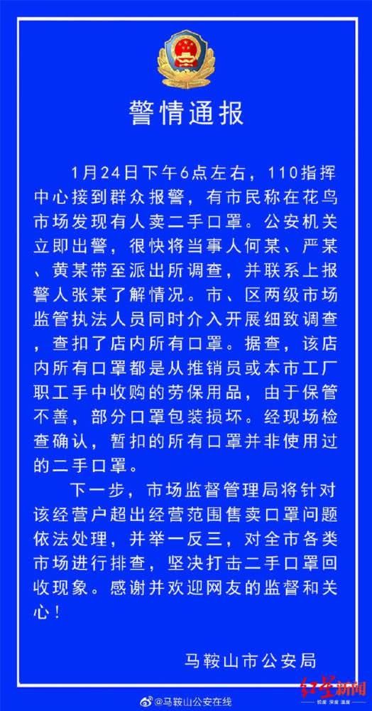 網(wǎng)傳“馬鞍山有人販賣二手口罩”情況不實的警情通報