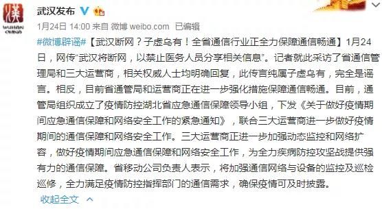 1月24日,網傳“武漢將斷網,以禁止醫務人員分享相關信息”。記者就此采訪了湖北省通信管理局和三大運營商,相關權威人士均明確回復,此傳言純屬子虛烏有,完全是謠言。相反,目前湖北省通管局和運營商正在進一步強化措施保障通信暢通。