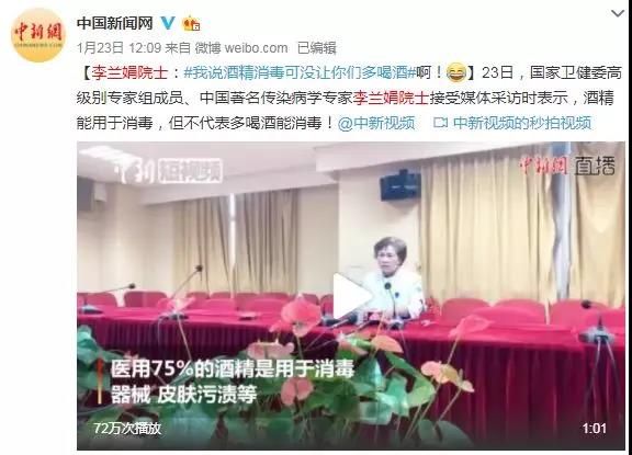 1月22日,國家衛健委高級別專家組成員、我國著名傳染病學專家李蘭娟院士在接受采訪時表示,新型冠狀病毒怕酒精,不耐高溫,75%的酒精是能夠殺滅這個病毒的。因此,話題#新型冠狀病毒怕酒精不耐高溫#登上熱搜,與之相關的“飲高度酒對抗冠狀病毒”的消息也迅速蔓延。對此,李蘭娟院士表示,醫用酒精擦拭能夠用于消毒,但不代表多喝酒能消毒。