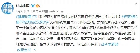 1月21日晚,國家衛健委官方微博@健康中國 對于喝板藍根、熏醋可以預防新型冠狀病毒的說法辟謠。