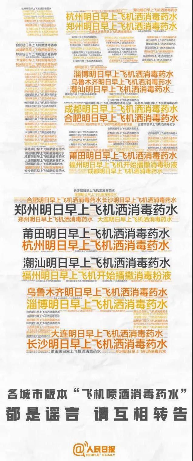 實際上,各城市版本的“飛機噴灑消毒藥水”的消息都是謠言,請大家相互轉告,不信謠,不傳謠!