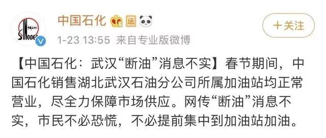1月23日,中國石化官方微博發布消息稱,網傳武漢“斷油”消息不實,市民不必恐慌,不必提前集中到加油站加油。