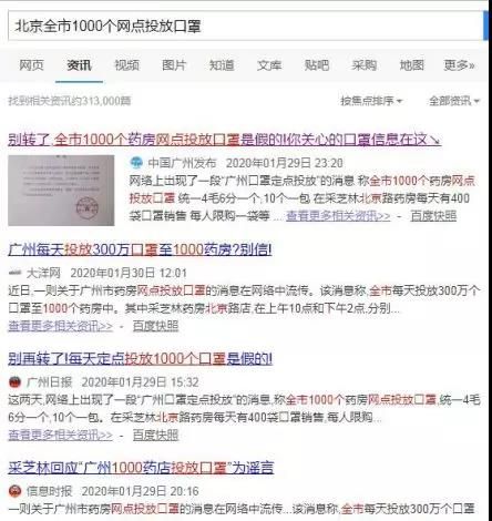 經(jīng)查證,該消息所附藥店名單中,一些藥店并沒有接到投放口罩的通知,同時搜索發(fā)現(xiàn)廣州、上海等多地也曾出現(xiàn)過同樣的信息,均已被辟謠。