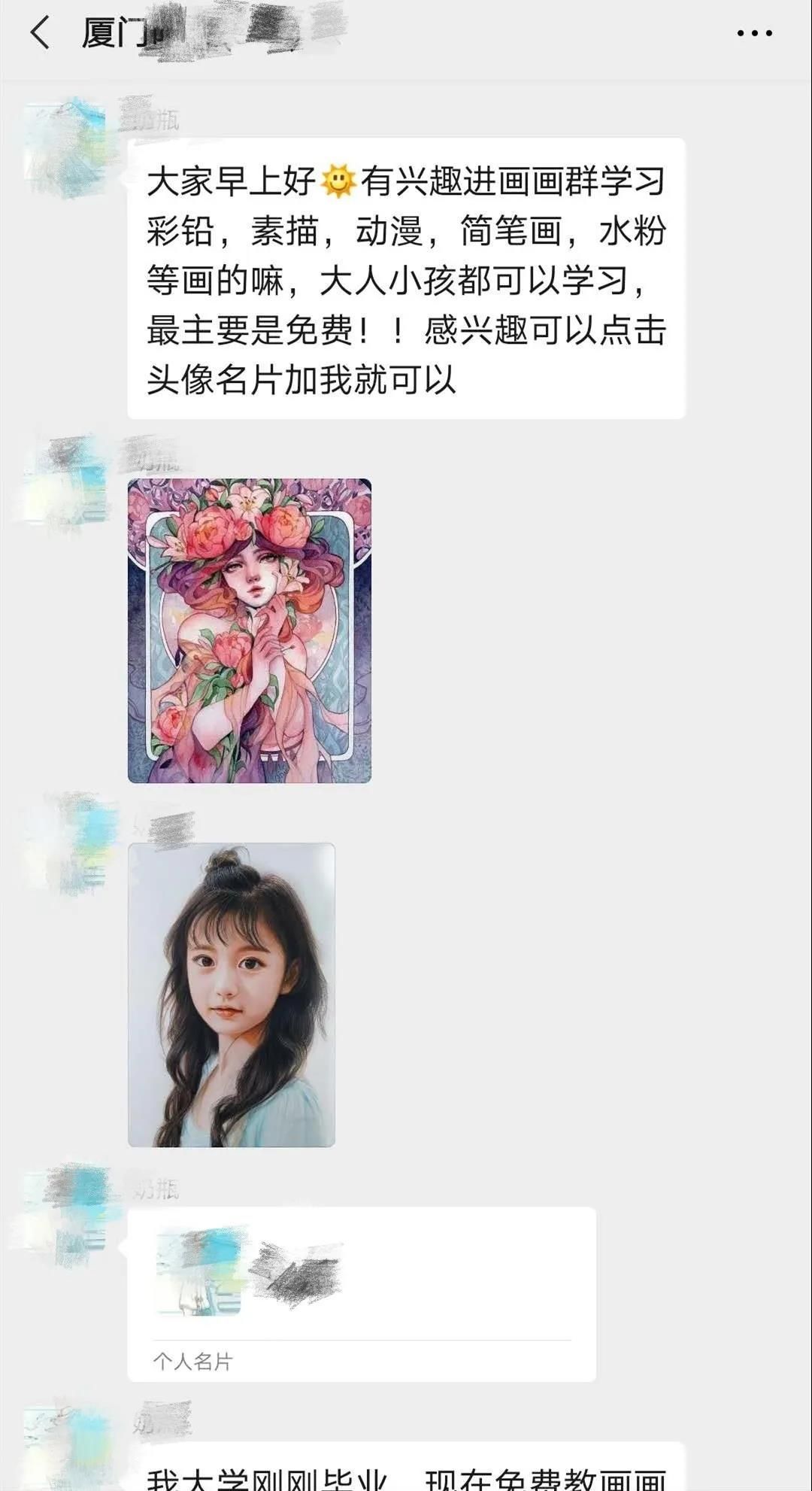 "有想進畫畫群的嘛,群里免費學(xué)習(xí)國畫,寫意花鳥畫、山水、水墨、工筆白描。課程需要人氣,加我微信 XXXXXXX進群學(xué)習(xí),通過:直播課+資料+圖片過程進行教學(xué),最主要是免費的。"
