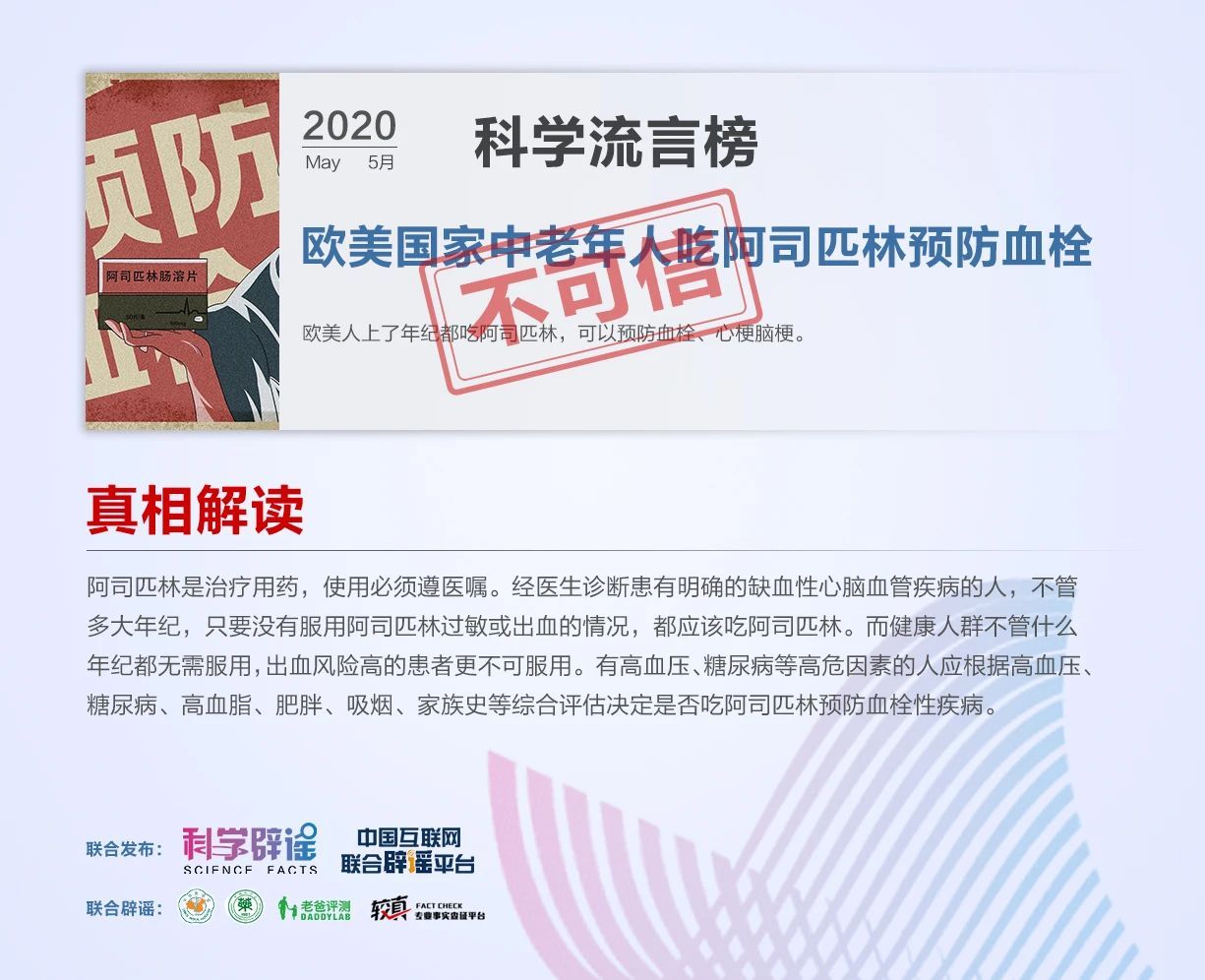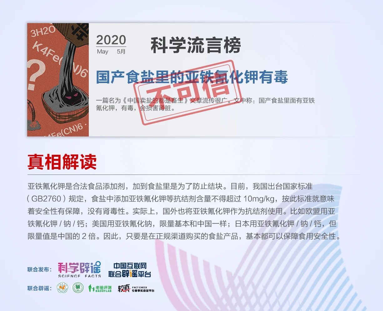 5G是新冠病毒的元兇?國產食鹽里的亞鐵氰化鉀有毒?歐美國家中老年人吃阿司匹林預防血栓?······中國互聯網聯合辟謠平臺和科學辟謠平臺共同發布5月“科學”流言榜,為你一一揭開真相。