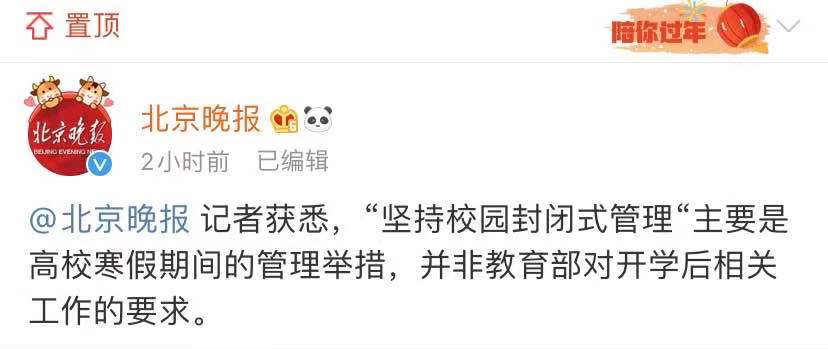 而后,北京晚報報道稱:“堅持校園封閉式管理”主要是高校寒假期間的管理舉措,并非教育部對開學后相關工作的要求。