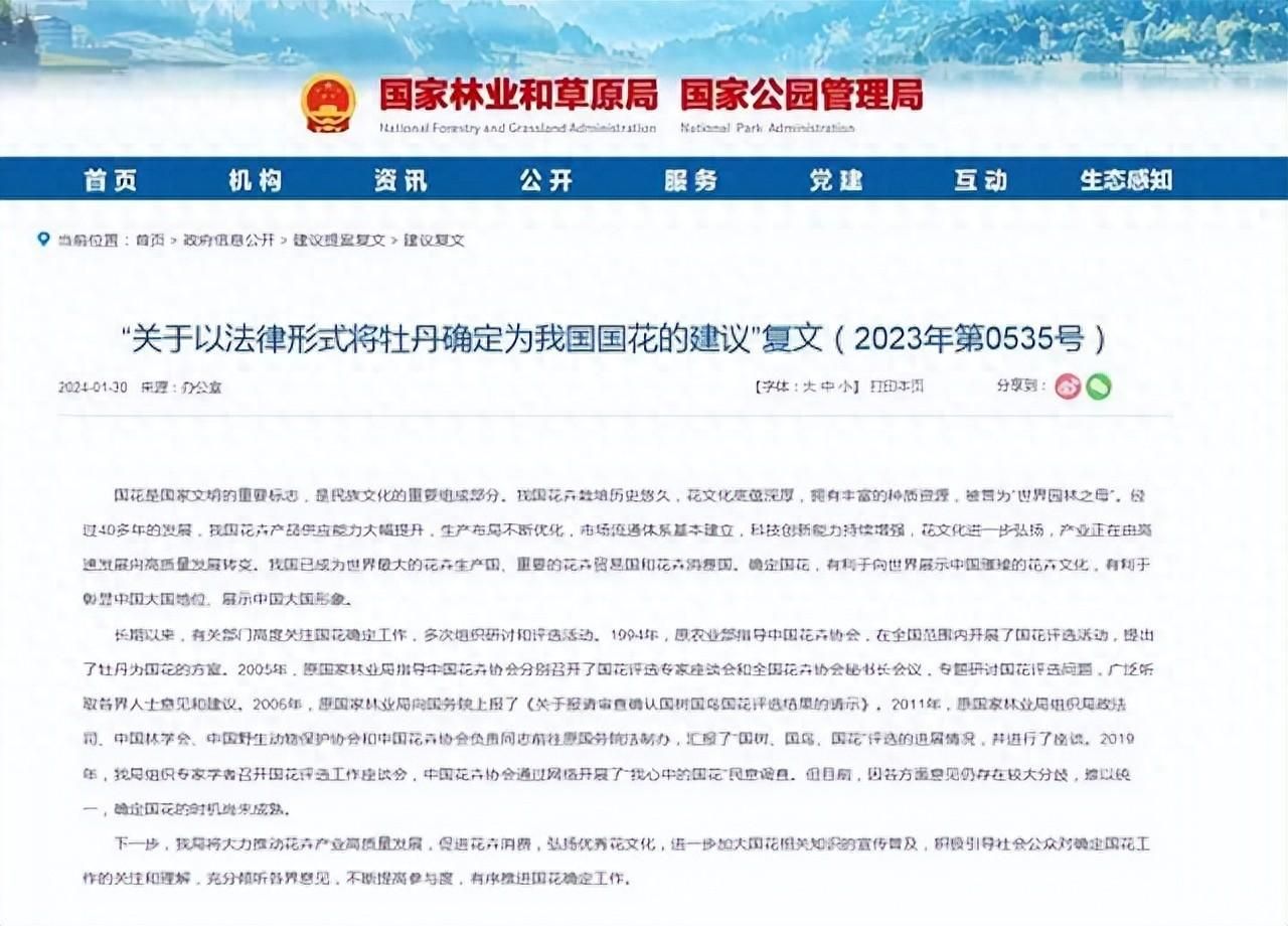 國家林草局官方網站近日發布了“關于將牡丹依法定為我國國花的建議”復文,表示目前因各方面意見仍存在較大分歧,難以統一,確定國花的時機尚未成熟。