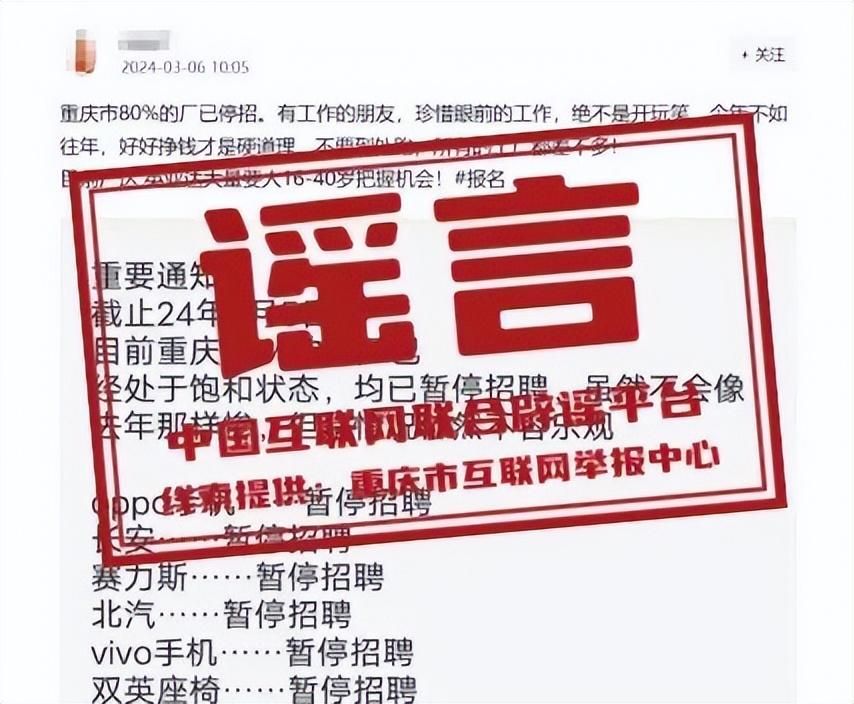 真相:近日,有網(wǎng)民在某網(wǎng)絡平臺上發(fā)布信息:“目前重慶市80%的廠已處于飽和狀態(tài),均已暫停招聘”,引發(fā)關注。經(jīng)重慶市人力資源和社會保障局核實,網(wǎng)傳信息為謠言。網(wǎng)民發(fā)布的所謂工廠停招信息中涉及的10余家企業(yè),并未暫停招聘。例如,賽力斯公司除個別崗位招滿不再招人外,其他未招滿的崗位還會繼續(xù)招聘;長安公司招聘工人以校招為主,社招為輔,前幾天還在面向學校春招。(來源:“重慶辟謠”微信公眾號)