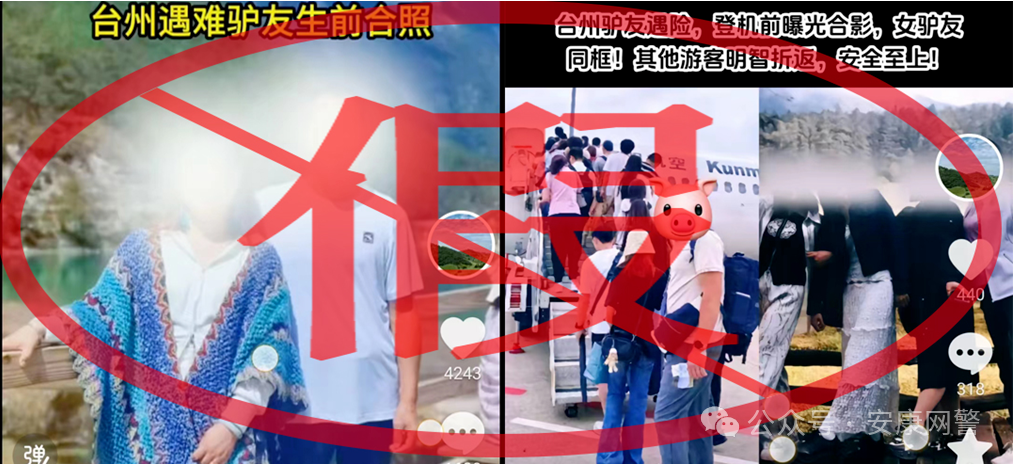 6月9日,熊女士來到陜西安康嵐皋縣公安局報警稱,其姐姐和父親外出旅游時拍的照片被他人發(fā)布在短視頻平臺,還配有“臺州遇難驢友生前合照”“臺州驢友遇險,登機(jī)前曝光合影”等虛假信息。