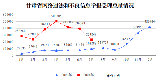 2024年7月,甘肅省委網信辦緊扣全省工作大局,發揮職能作用,全面排查清理網絡違法和不良信息,著力推動網絡綜合治理體系建設取得新成效,共受理各類舉報信息23.4萬件,同比增長129%。