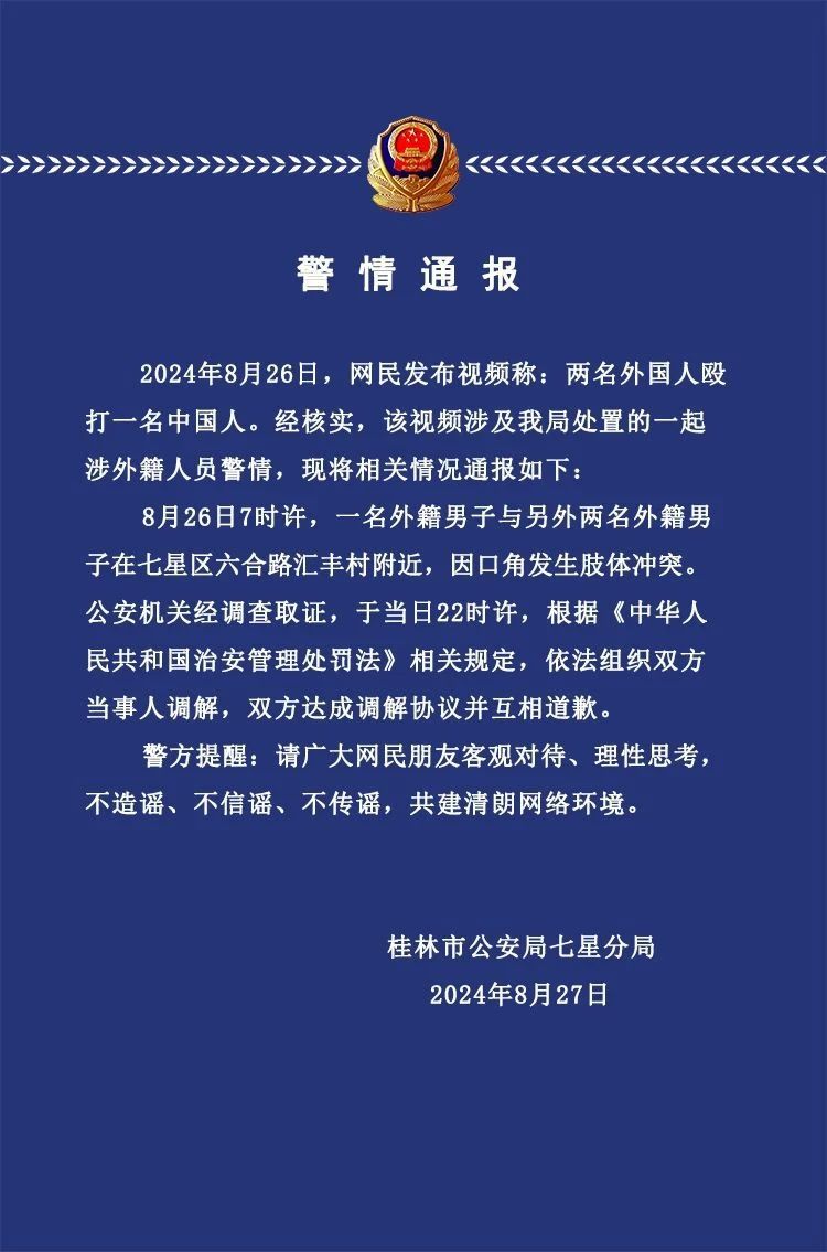 經廣西桂林市公安局七星分局核實,該視頻實為三名外籍男子因口角發生肢體沖突,不存在“外國人毆打中國人”的情況。