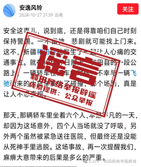 10月27日,個別網民在今日頭條、網易等平臺編造信息稱:“新疆和田縣發生了一起讓人心痛的交通事故,四個人當場就沒了呼吸。”