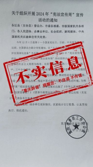 經向相關部門核實,重慶市普法辦并未印發此類文件,此通知內容為虛假信息。目前,相關線索已轉交公安部門進一步調查處置。