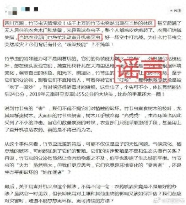 近日,網(wǎng)上出現(xiàn)“四川萬(wàn)源,竹節(jié)蟲(chóng)災(zāi)情爆發(fā)”的信息,并稱當(dāng)?shù)剞r(nóng)業(yè)部門(mén)也急忙出動(dòng)直升機(jī)來(lái)滅蟲(chóng)。萬(wàn)源市委網(wǎng)信辦第一時(shí)間轉(zhuǎn)交萬(wàn)源市林業(yè)局調(diào)查核實(shí),經(jīng)核查,該信息為謠言。萬(wàn)源市當(dāng)?shù)亓謪^(qū)未出現(xiàn)成千上萬(wàn)的竹節(jié)蟲(chóng),萬(wàn)源市農(nóng)業(yè)部門(mén)也未出動(dòng)直升機(jī)來(lái)滅蟲(chóng),請(qǐng)廣大網(wǎng)民不信謠、不傳謠。