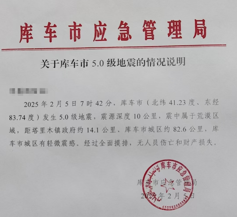 經(jīng)庫車市應(yīng)急管理局核實(shí),未接到人員傷亡和財(cái)產(chǎn)損失情況報(bào)告。