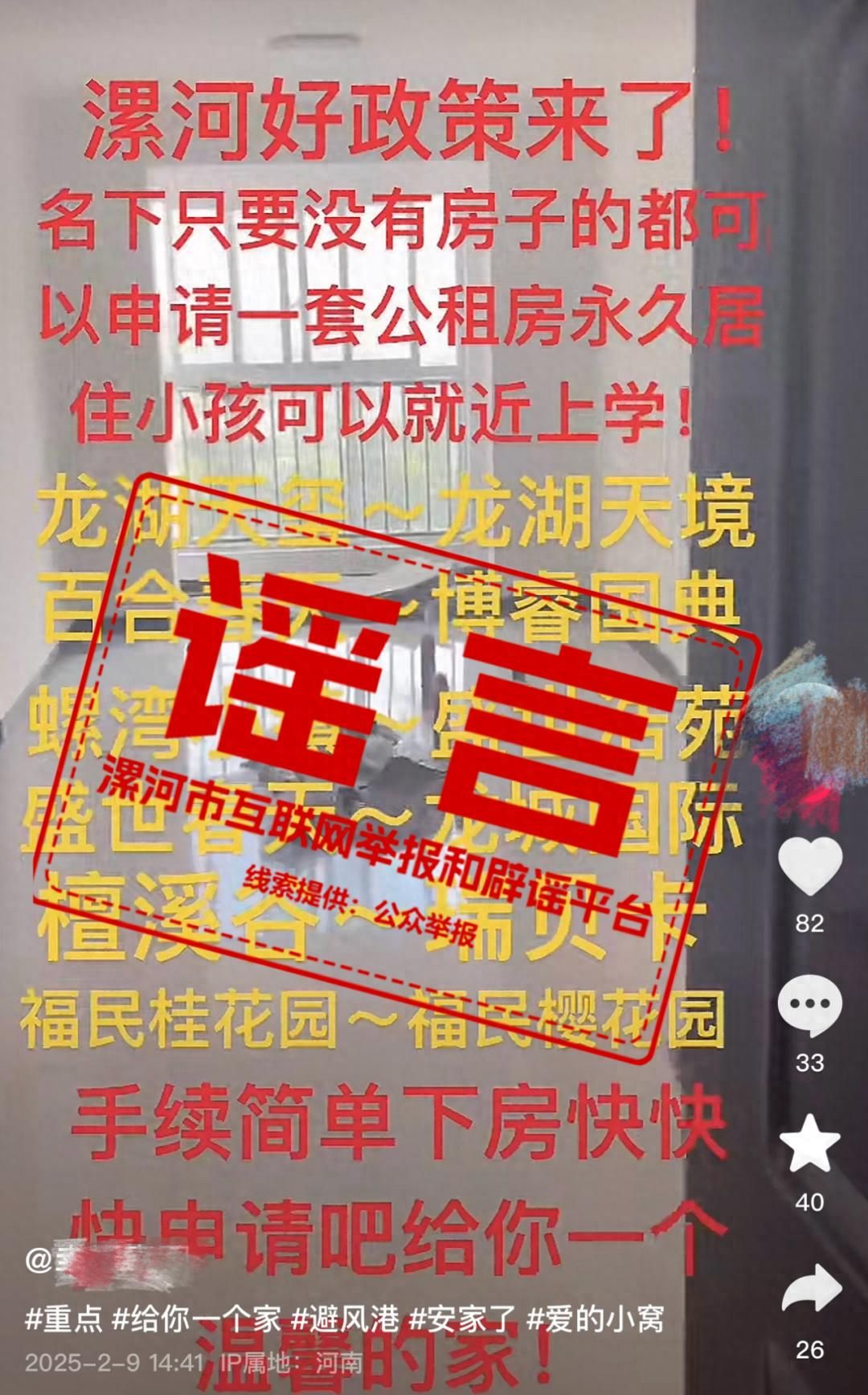 經向漯河市住房保障中心核實,以上內容均為虛假不實信息,是對漯河市公租房政策的歪曲理解和斷章取義,以可獲取房源為由誆騙廣大市民,獲取不當利益。