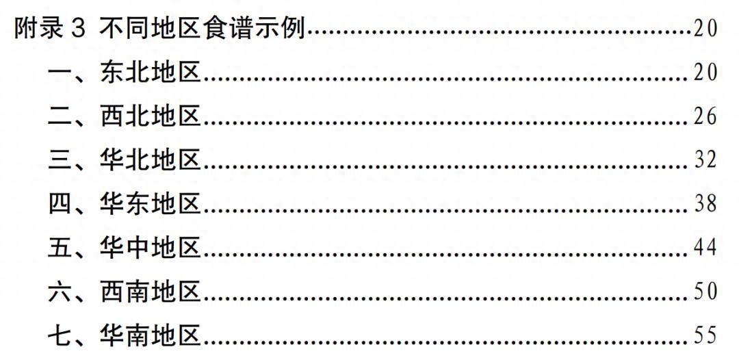 值得注意的是,這份食譜細(xì)化到了全國(guó)不同地區(qū)的食譜示例,并備注了食譜的“總能量”。