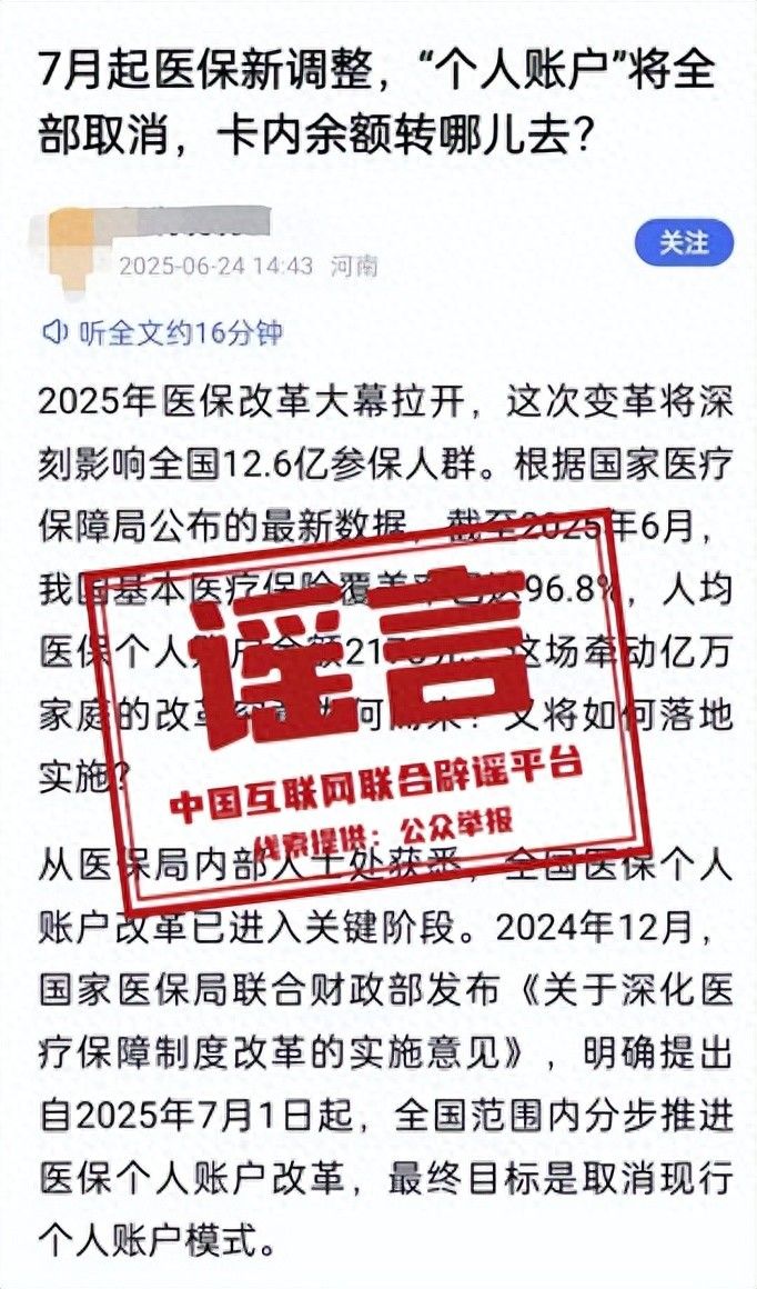近日,一篇題為《7月起醫保新調整,“個人賬戶”將全部取消,卡內余額轉哪里去?》的自媒體文章引起較多關注。文中宣稱“從醫保局內部人士處獲悉,全國醫保個人賬戶改革已進入關鍵階段。2024年12月,國家醫保局聯合財政部發布《關于深化醫療保障制度改革的實施意見》,明確提出自2025年7月1日起,全國范圍內分步推進醫保個人賬戶改革,最終目標是取消現行個人賬戶模式”。隨后,不少自媒體也發布了類似內容。