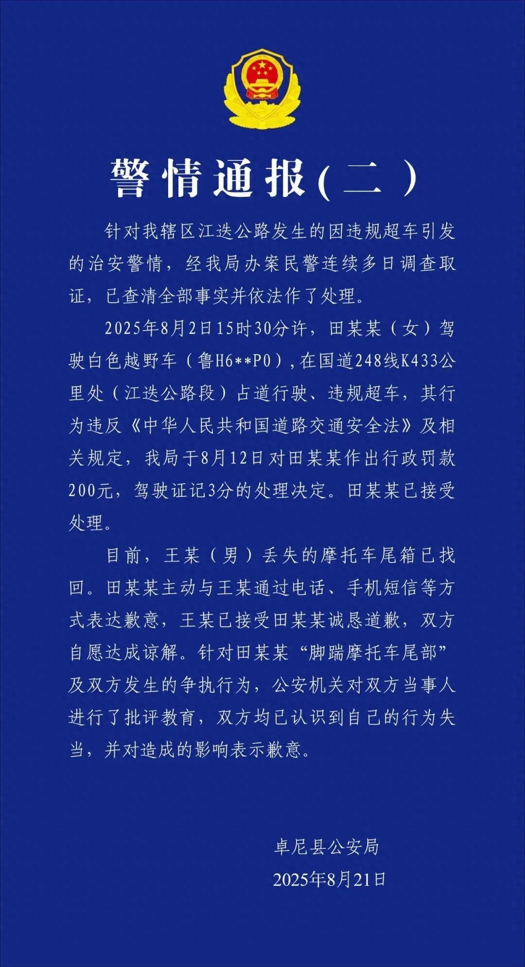 2025年8月2日15時30分許,田某某(女)駕駛白色越野車(魯H6**P0),在國道248線K433公里處(江迭公路段)占道行駛、違規超車,其行為違反《中華人民共和國道路交通安全法》及相關規定,我局于8月12日對田某某作出行政罰款200元,駕駛證記3分的處理決定。田某某已接受處理。