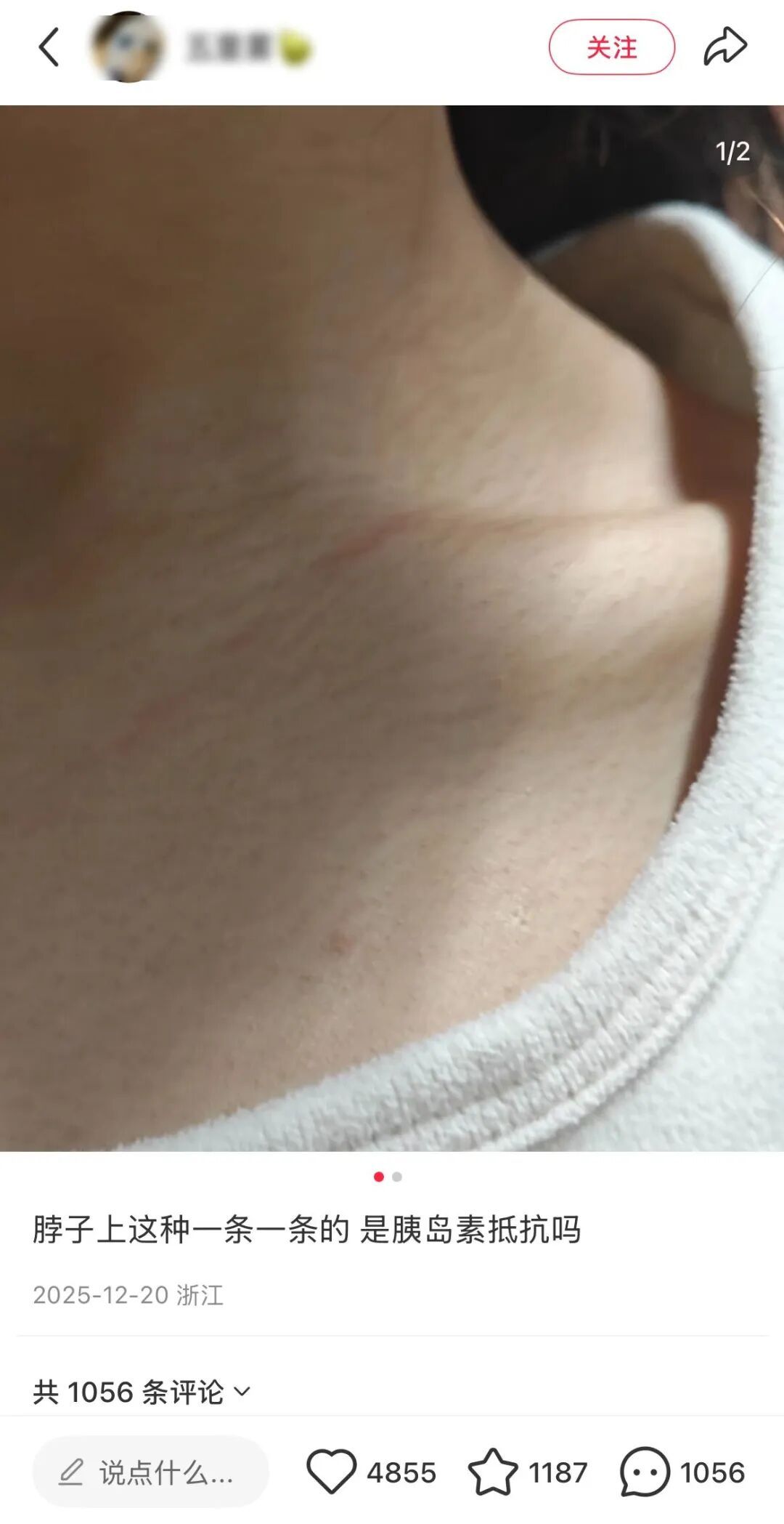 最近有網友發帖求助“脖子上這種一條一條的,是胰島素抵抗嗎”