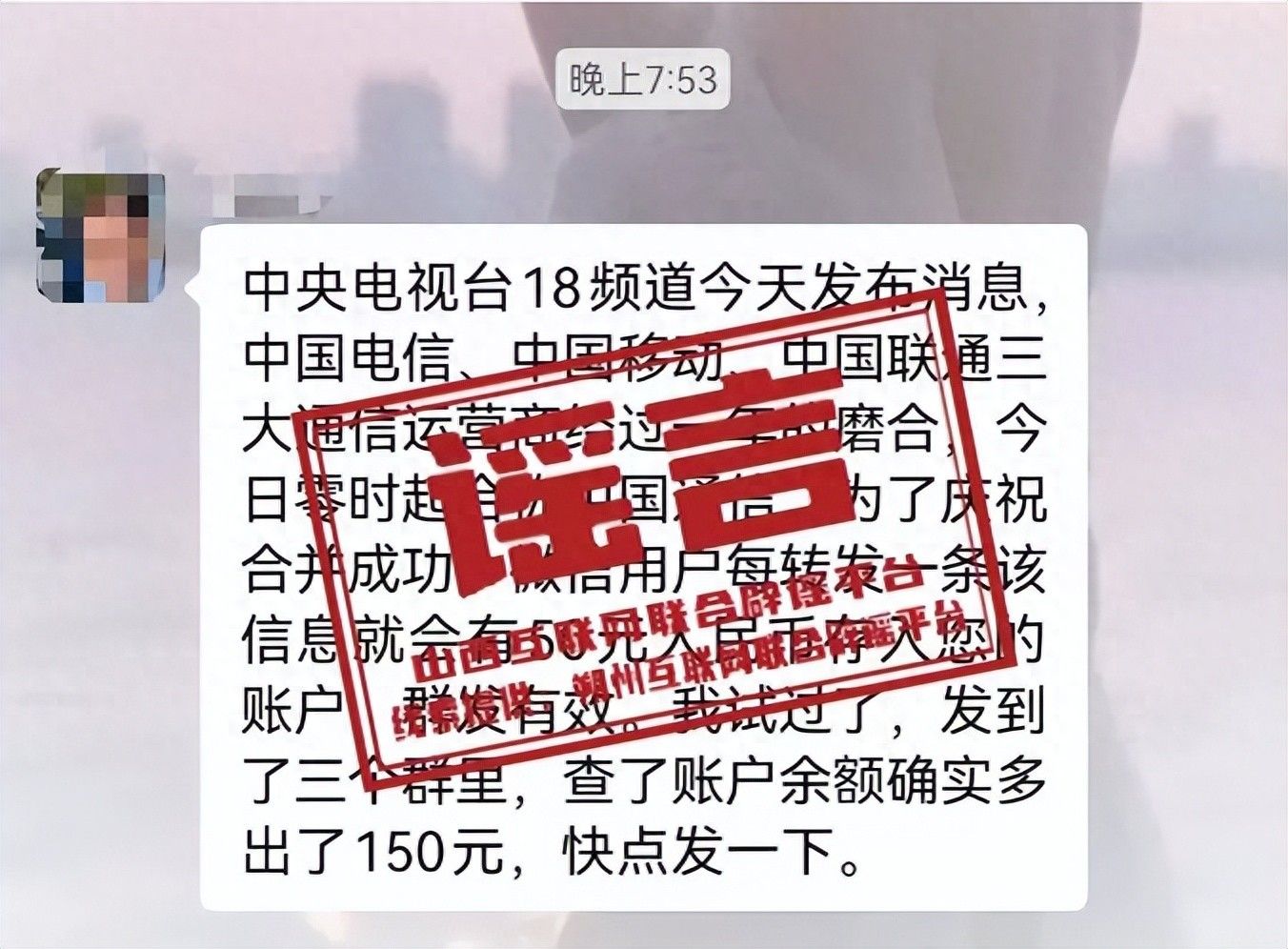 近日,一則“中央電視臺18頻道今天發布消息,中國電信,中國移動,中國聯通三大通信運營商經過一年的磨合,今日零時起合稱中國通信。為了慶祝合并成功,微信用戶每轉發一條該信息就會有50元人民幣存入您的賬戶,群發有效。我試過了,發到了三個群里,查了賬戶余額確實多出了150元,快點發一下。”的消息在山西省朔州市多個微信群熱傳。經核實,該消息純屬謠言,請廣大網民切勿輕信、切勿轉發。
